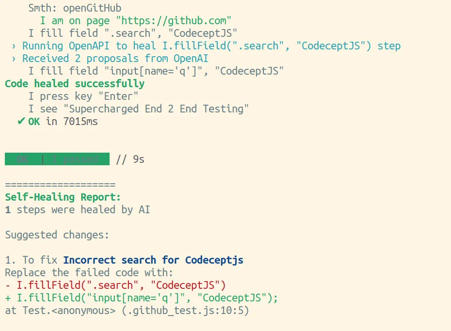 To activate the AI healer don’t forget to run tests with --ai flag.
